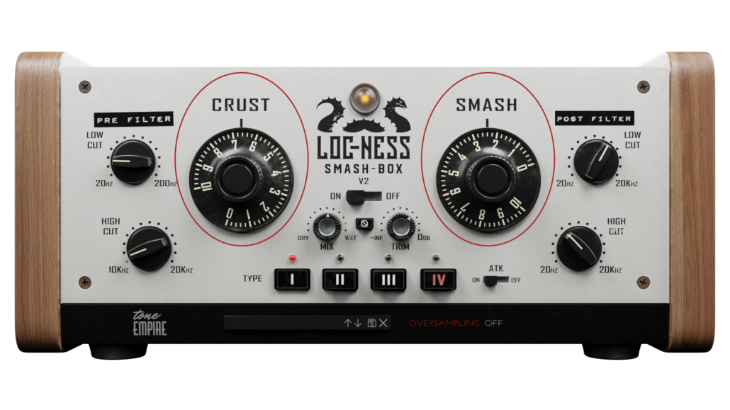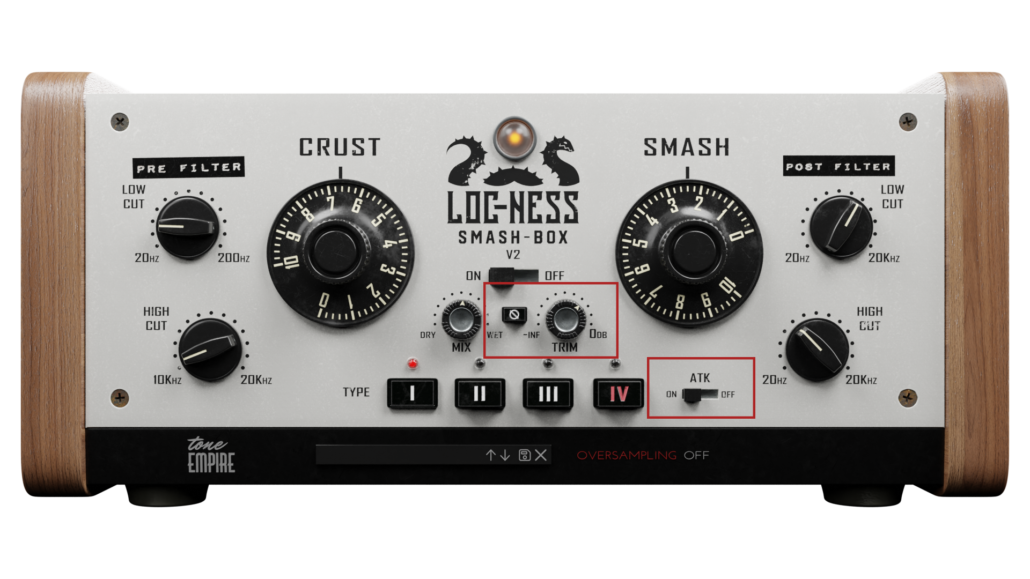This section has a full range low cut and high cut filter section to shape the sound post-crash and smash. This is especially useful when blending in the dry signal with the processed signal.