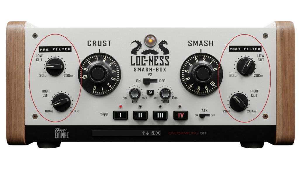 Here we provide – low cut and high cut first-order filters to affect the signal going into the saturation and then compression section. Hence one can change the effect of “Crust” and “Smash” by the prefilter.